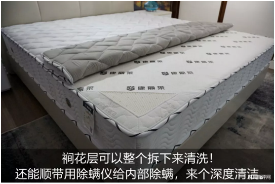 一個(gè)讓人很有好感的地方——床墊上層能整個(gè)拆下來(lái)清洗(建議干洗)。還可以順帶著用除螨儀給床墊內(nèi)部除除螨,來(lái)個(gè)深度清潔,從根源上預(yù)防細(xì)菌和螨蟲的滋生。即使懶得清洗,時(shí)不時(shí)拆下來(lái)拿出去抖抖曬曬也是極好的。更強(qiáng)大的是用久了,還可以再重新定制一個(gè)新的裥花層,搖身一變,又是一個(gè)新床墊的樣子。