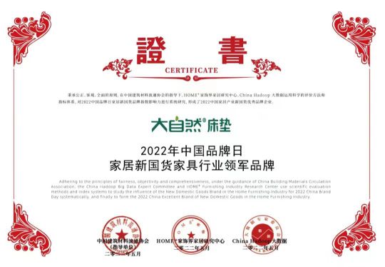 大自然床墊不負(fù)眾望,繼2020、2021年之后,第三次榮膺家居新國貨家具行業(yè)領(lǐng)軍品牌的稱號(hào)。