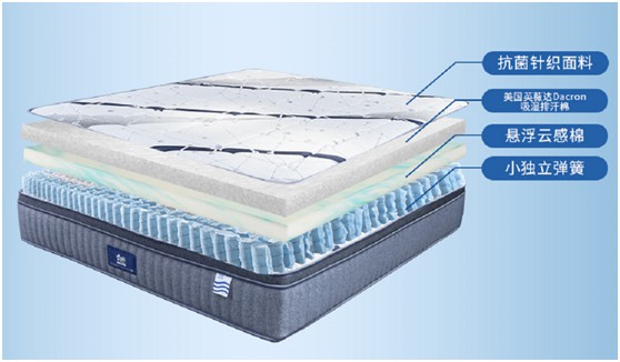 為了讓睡眠更加舒適,50°家床墊還采用了懸浮云感棉材料和抗菌防螨針織面料。其內(nèi)部形成了一個自由循環(huán)的微氣候環(huán)境,具有極強的透氣性能,能有效去除潮濕。表面親膚柔軟,具有抗菌性能,從內(nèi)到外打造出一個健康的睡眠環(huán)境。