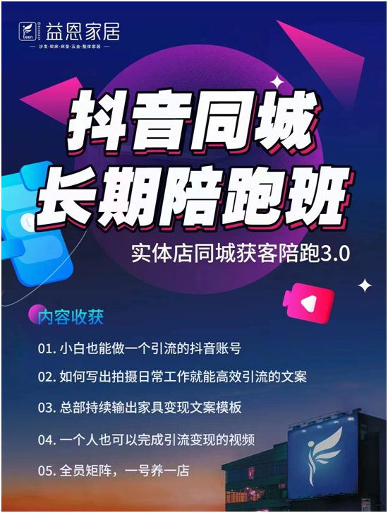 為了門店引流獲客,提升經銷商線上獲客能力,益恩家居總部舉辦第三期抖音同城長期陪跑班。本期學員共計70余人參加,課程涵蓋:搭建引流的抖音賬號、高效引流文案、實體商家直播課程、線上線下相結合的引流活動。