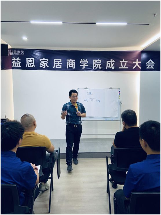 益恩家居董事長尹總為商學院成立大會致辭。尹總對商學院的相關情況進行簡述,并呼吁全體益恩家人積極參與學習,不斷提升自我。他提到,益恩家居商學院成立的目的,在于幫助渠道商成交他們的客戶,達成業績,實現精準賦能,助力終端門店破局而生。為此,益恩家居通過商學院計劃向全國經銷商提供高素質人員培養支持,致力打造一支遍布全國各地的益恩金牌終端隊伍。