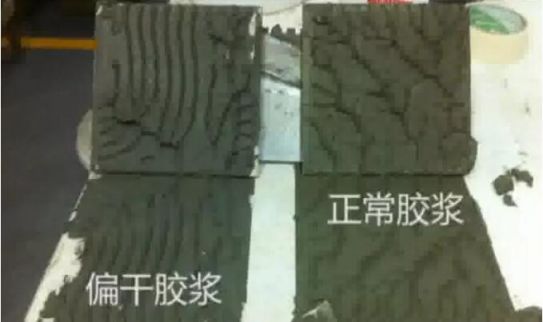 左方偏干膠漿,分布不勻稱;右方正常稠度膠漿分布均勻到瓷磚背面,滿漿率更高。
