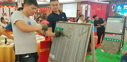 通過了解理論知識與產品觀摩后,師傅們現場結合打砸實踐,檢驗品質的真實力。暴力檢驗下,每一組打砸檢驗臺都印證了樓邦粘結劑打不落、砸不掉的震撼事實,贏得全場歡呼大贊不已,紛紛感受到了樓邦匠心筑家品質的優異。