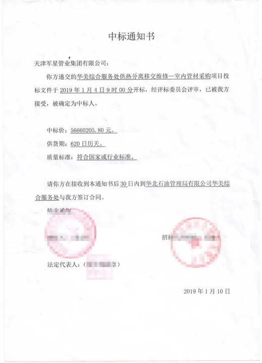 為優化企業發展,促進自身提質增效,華北油田全面推進礦區“三供一業”分離移交工作,2019年5月任丘礦區全面啟動供熱維修改造工程,一系列措施下發執行,各項工作逐步推進。這一維修改造工程規劃涵蓋面廣,涉及老舊社區數量多,施工質量要求高,華北油田為保障工程順利進行,規范流程,強化管理,嚴格把關,最終選擇天津軍星管業集團有限公司做為該項目的室內管材采購項目供應商。