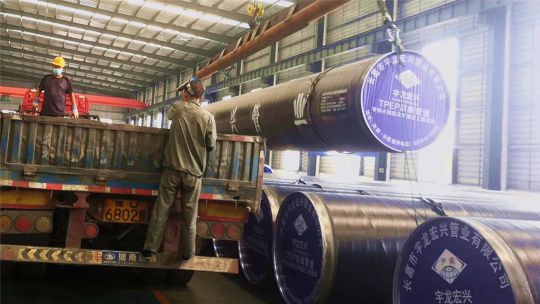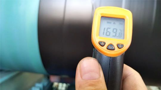 然而,這并不是車間最高的氣溫。我們再看一下防腐車間外防工序的溫度。169.8℃!這是外防最后一道生產工序,管體附近0.5m處的溫度。這是宏興管業公司氣溫最高的地方。員工的工裝,已經不能用濕透來形容了。在這個地方,即便工裝濕透了,很快就會被烘干。