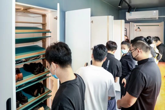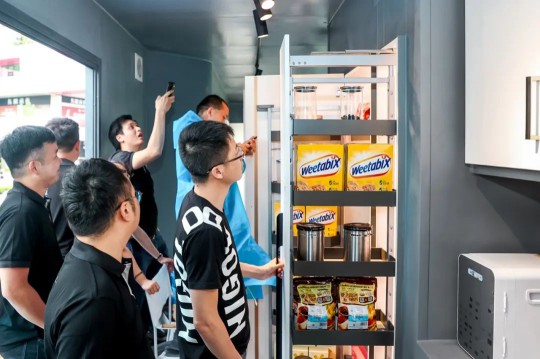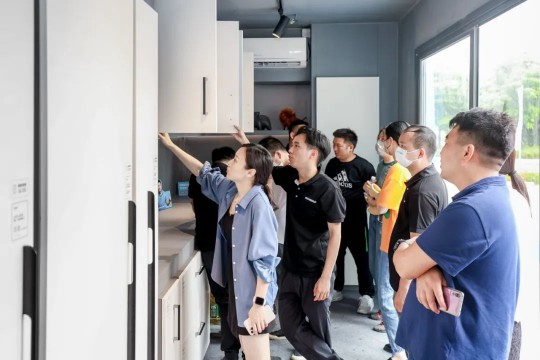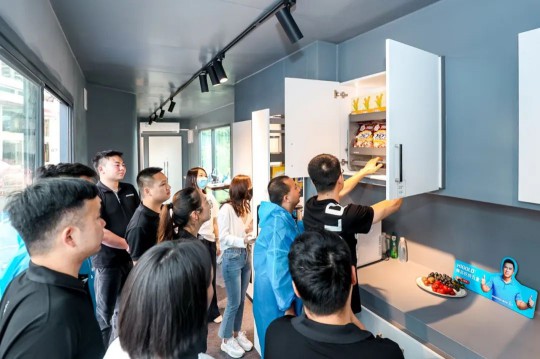活動當日,悍高總部工作人員和眾多意向客戶紛紛登上集裝箱內,親自體驗來自悍高原創力作的多款功能五金產品,其中包含廚房五金希勒4.0系列、星鏈系列、飛碟3.0系列、希勒太空艙3.0系列、希勒高伸拉籃系列與衣柜功能五金BV系列全套產品,展廳現場絡繹不絕、熱鬧非凡。