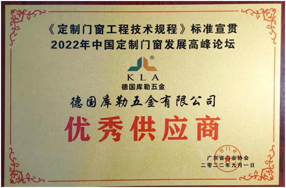 2022年9月1日,“《定制門窗工程技術(shù)規(guī)程》標(biāo)準(zhǔn)培訓(xùn)暨2022年中國定制門窗發(fā)展高峰論壇”在佛山希爾頓酒店隆重舉辦。庫勒五金受邀出席,并在頒獎典禮現(xiàn)場榮獲“優(yōu)秀供應(yīng)商”榮譽(yù)!