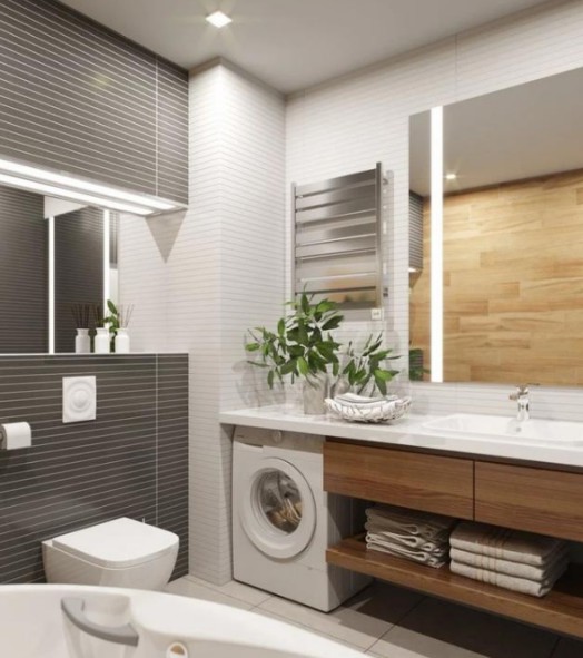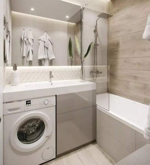 在很多家庭中,洗衣機上方的空間是懸空的。所以最好將洗漱區(qū)和洗衣區(qū)結合起來。洗衣機上面就是洗漱臺,最大程度地利用好了每一處空間。