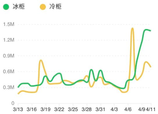 微信指數(shù)顯示,自4月7日以來,關(guān)鍵詞“冷柜”的熱度呈現(xiàn)大幅上升趨勢;關(guān)鍵詞“冰箱”更是在4月10日達到近30日的高點。