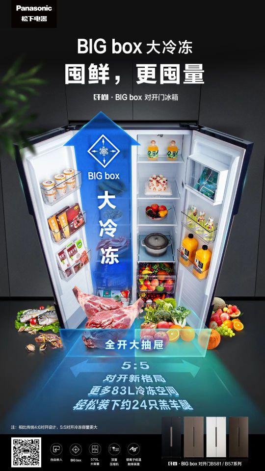 說起關(guān)鍵詞「保鮮」、「容量」,松下纖尚 · BIG box對開門冰箱便會出現(xiàn)在面前,570L超大容量,255L冷凍空間,足以應(yīng)對一家人常見食材兩周的存儲。