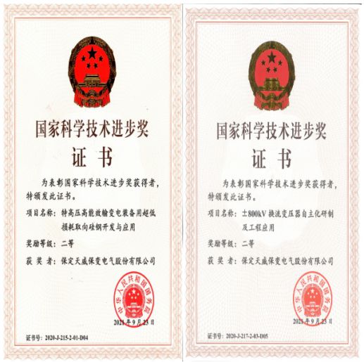 11月3日上午,中共中央、國(guó)務(wù)院在人民大會(huì)堂隆重舉行2020年度國(guó)家科學(xué)技術(shù)獎(jiǎng)勵(lì)大會(huì)。保變電氣參與完成的“特高壓高能效輸變電裝備用超低損耗取向硅鋼開發(fā)與應(yīng)用”、“±800kV換流變壓器自主化研制及工程應(yīng)用”分別獲得國(guó)家科學(xué)技術(shù)進(jìn)步獎(jiǎng)二等獎(jiǎng)。