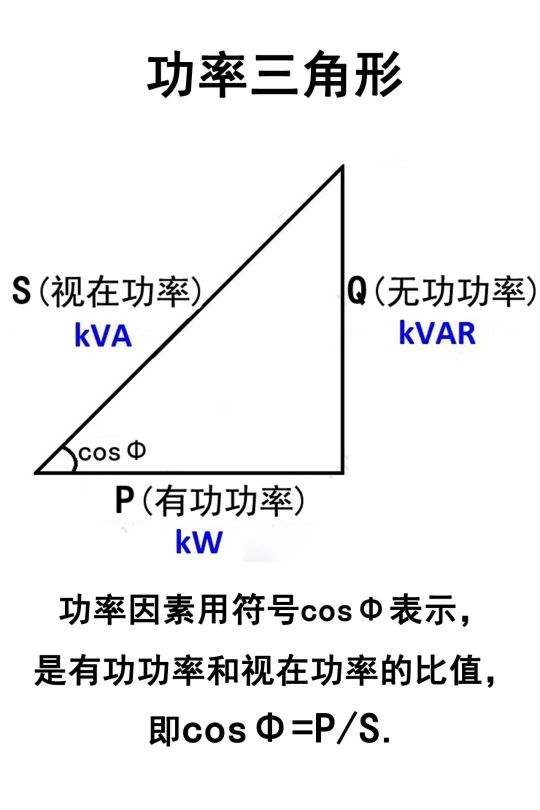 有功功率、無功功率和視在功率,它們存在一種三角函數關系,cosΦ稱為功率因素,也就是有功功率和視在功率的比值,即cosΦ=P/S. 這個值有助于我們正確選擇變壓器容量大小。