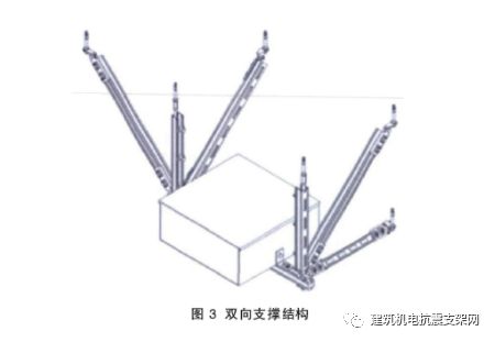 縱向支撐結構所謂縱向支撐(圖 2),是指斜支撐水平投影方向平行于管道軸線??v向支撐用于消除地震水平荷載中平行于管線方向的荷載,防止管線在地震中整體縱向位移。不同于側向支撐,縱向支撐在系統中設置的數目較少,每個直管段應至少設置一個縱向支撐支吊架,當兩個縱向支撐間距超過設計最大間距,需要按《建筑機電工程抗震設計規范》第 8.2.3條要求間距增設縱向支架。雙向支撐結構綜合了側向支撐和縱向支撐兩種支撐形式特點的支撐結構即為雙向支撐結構,又稱四向支架(圖 3),一般適用于機電管線較多、支架承重較大的情況