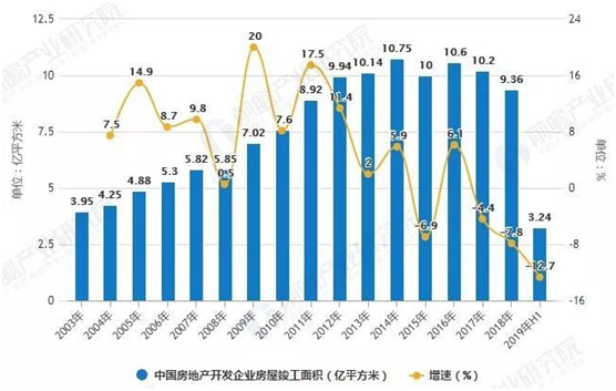 2003-2019年H1中國房地產(chǎn)開發(fā)企業(yè)房屋竣工面積統(tǒng)計及增長情況