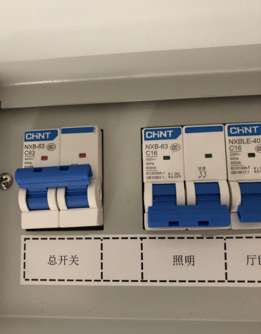 從左面左手第二個(gè)開關(guān)一般安裝照明回路的分開關(guān)。建議大家選用1P+N或者是2P的空氣開關(guān);額定電流建議大家選擇C10A安的,或者是C61A的都可以。