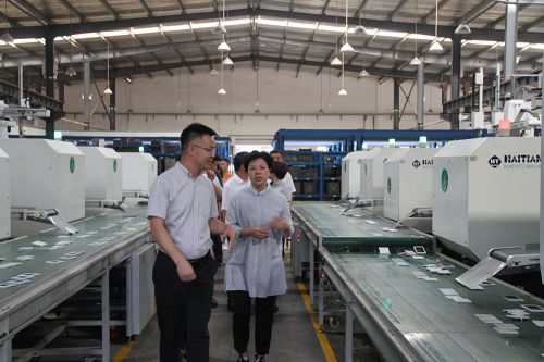 接下來,湘潭市市長張迎春參觀了注塑車間,注塑車間采用機械手代替人工,實施人機分離工程,不僅延長了產品的冷卻周期,鞏固了產品結構的質量,而且將產品與噴嘴分離,降低了人工成本。