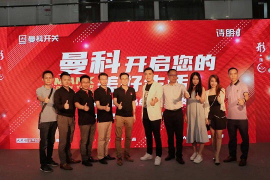 亮燈儀式環節, 廣東省定制家居協會秘書長、廣東衣柜行業協會秘書長曾勇,錦力電器總經理伍健聰、研發總監黃子斌、營銷總監趙明奇,曼科千萬級經銷商——東莞石龍獅龍公司總經理陳川堯、深圳德明發公司總經理鄭良忠共同上臺亮燈,這也標志著曼科“詩朗”系列新品正式上市!