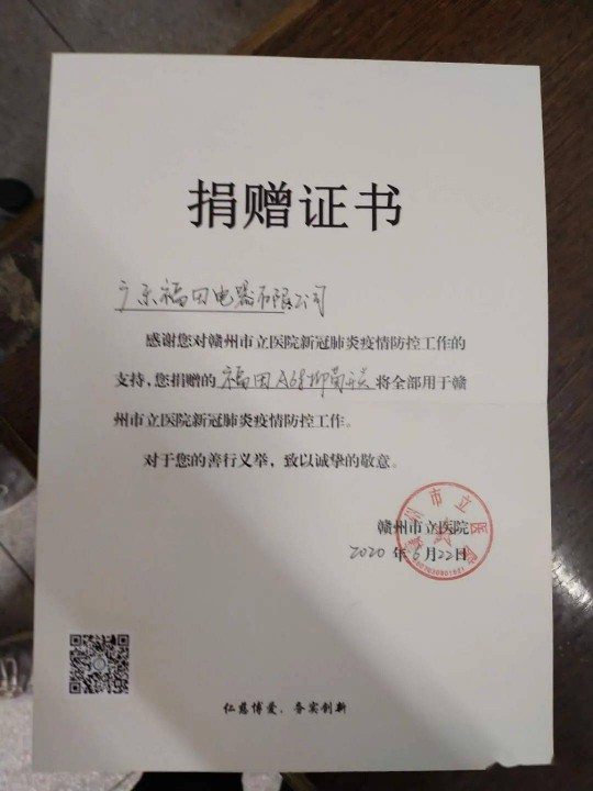 2020年6月中旬,福田江西辦事處及贛州經銷商豐裕五金塑膠有限公司,多次與贛州市立醫院溝通,達成捐贈意向。