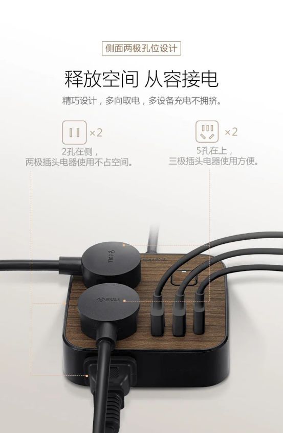 除了耐看,木紋插座還配備兩個兩孔插口,兩個五孔插口,兩個USB插口和一個Type-C插口,滿足多電器同時用電。兩孔分布在插座側邊保證了各個插頭間不打架。