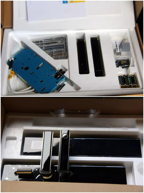 打開包裝后,內部整齊地擺放著指紋鎖、鎖體、鑰匙、卡片、電池、各類說明書以及一盒叫不上名字的零部件。