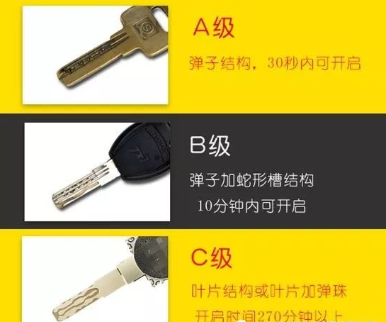 目前,家用鎖芯一般有三個等級,即甲、乙、丙(超級乙)。丙級鎖芯是目前市場上最安全的鎖芯類型。它可以阻止超過270分鐘的技術開啟。鎖芯等級可以通過鑰匙來區分。鎖芯可細分為十字型、4槽、8槽等。一般分類可根據下圖進行區分。