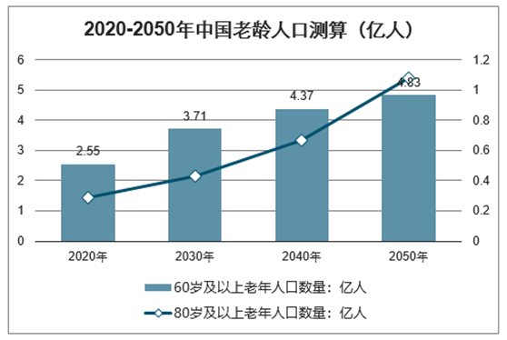 據(jù)《2019-2025年中國老年健康服務(wù)行業(yè)市場全景調(diào)查及投資方向研究報告》數(shù)據(jù)顯示:2018年末中國60歲及以上人口已達24949萬人,占17.9%,未來中國老齡人口仍將進一步增加。同時,該報告預(yù)測到2020年我國60歲及以上老年人口數(shù)量將達到2.55億人,80歲及以上老年人口數(shù)量也將達到0.29億人。