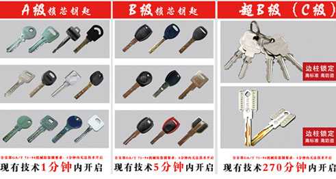 據了解,根據國家機械防盜標準,家庭防盜鎖被分為A級鎖和B級鎖,A級鎖芯內部結構非常簡單,僅限于彈子的變化,彈子槽少而淺,防技術性開啟時間只在1分鐘內,而且互開率極高。而B級鎖鑰匙為平板鑰匙,有雙排彈子槽、雙排月牙鎖芯、內銑牙葉片鎖芯,跟A級鎖不同的地方在于鑰匙面多了一排彎彎曲曲不規則的線條,防技術性開啟時間為5分鐘內。另外,由于鎖具生產技術的不斷提高,在鎖具行業內部也有更細分的一套標準,叫做超B級鎖和C級鎖。中消協曾表示,這兩種鎖只要達到國家B級鎖的基本要求,即可以將超B級鎖和C級鎖視為B級鎖。