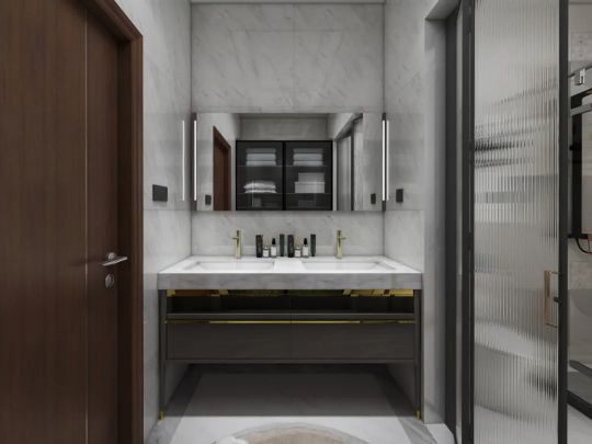 實木的柜體,詮釋著高級的時尚與溫柔,融入金色金屬元素,搭配阿瑪尼灰巖板的臺面,華麗背后蘊藏著悠悠溫情。將輕奢INS風展示得淋漓盡致,給浴室空間增添了一抹亮色。