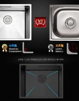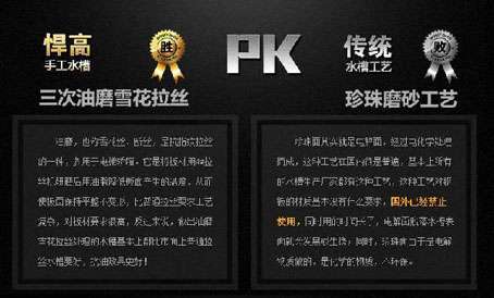 選購水槽,除了要考慮水槽的材質外,水槽的工藝以及款式設計同樣不容忽視。筆者看到,一些不銹鋼水槽雖然采用的是相同的材質,但在價格上就存在著差異。很多不銹鋼水槽采用的是珍珠磨砂工藝。“雖然這種工藝在國內非常普遍,對鋼板的材質沒有什么要求,但是國外已經禁止使用,同時用的時間長了,水槽表面就會發黑或生銹,而且珍珠棉由于是電解物質做的,是化學的物質,不環保。而悍高手工水槽采用的是三次油磨雪花拉絲的工藝,處理過的亞光面層更不易殘留油污、水漬,更易清潔。”銷售員林小姐告訴筆者。科普一下:油磨,也稱雪花絲、斷絲,是指指紋拉絲的一種,多用于電梯轎廂。它是將板材用4#拉絲機研磨后用油脂降低板面產生的溫度,從而使板面保持平整不變形,比普通拉絲要求工藝復雜,對板材要求很高,反過來說,做出油磨雪花拉絲處理的水槽基本上都比市面上普通拉絲水槽要好,抗油效果更好。