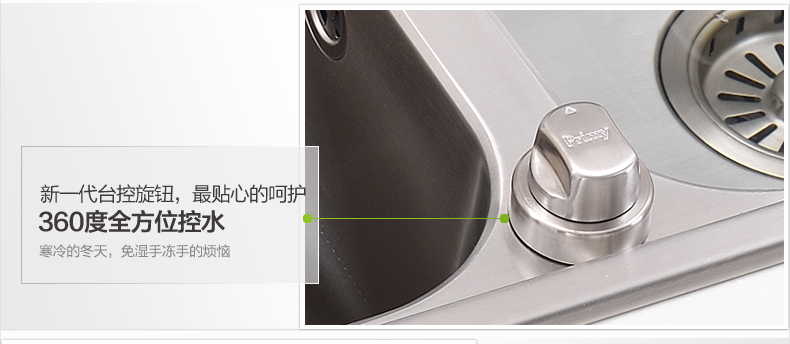 新一代臺控旋鈕,360度旋轉,可以控制左右兩個水槽,輕輕一轉,存放水隨心所控,再也不用擔心冬天濕手凍手了。