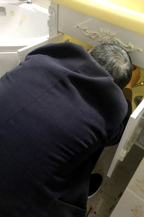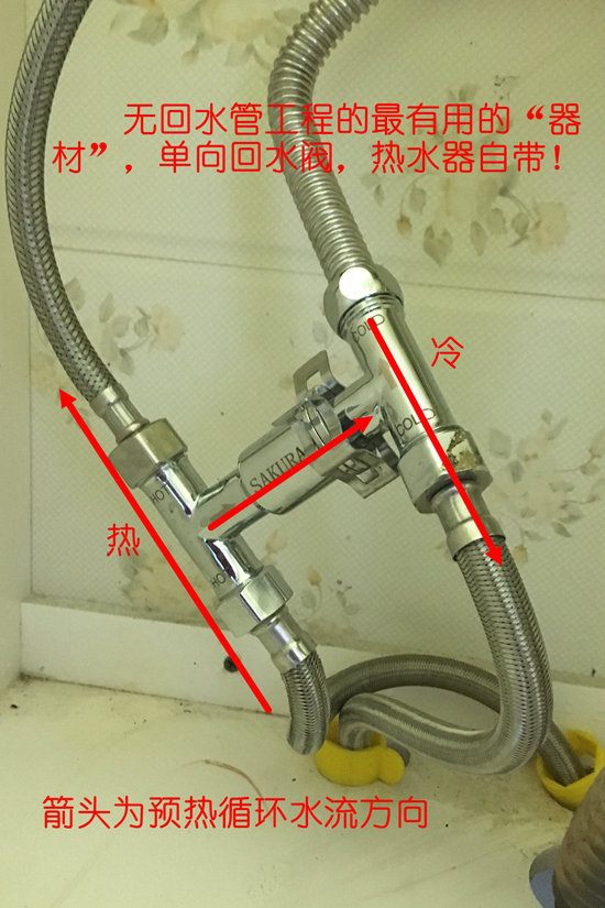 接下來就是找到用熱水最遠端,拆下原來的管子后,裝上“隨機”單向回水閥。由于位置低,師傅操作空間狹小,很不方便,但師傅什么都沒說,繼續埋頭苦干。后圖就是師傅的成果,也是這個“無回水管”工程的最重要的一個環節。要是沒有這個單向回水閥,熱水循環不起來,也得不到“預熱”的效果,也節約不了!