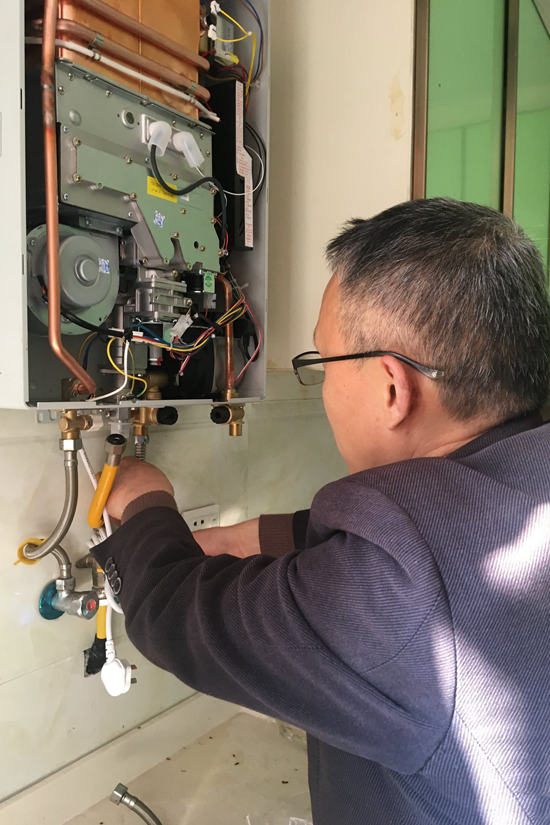 三、在原有位置,師傅熟練地掛上新機,接上冷水管,熱水管和燃氣管。