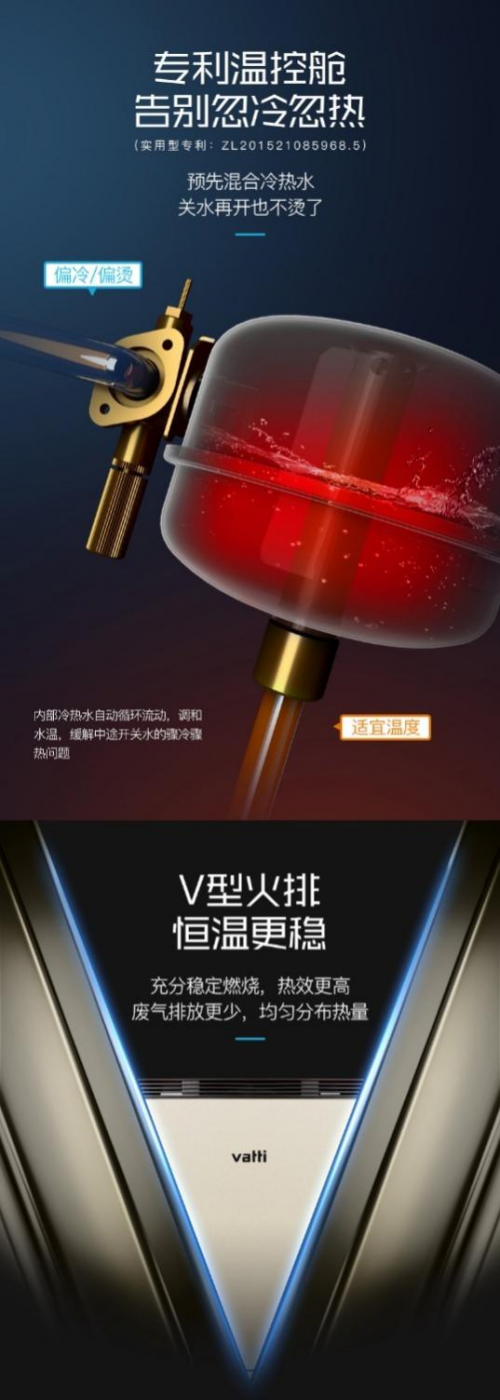 首先,隨著華帝專利技術溫控艙的安裝,熱水器中安裝了一個水箱。容器預先與冷水和熱水混合,以確保流出前的適當溫度。因此,即使擦洗肥皂和洗滌劑之間的間隙被關閉幾分鐘以節約用水,冷水也不會花一會兒就流出來了。此外,解決了水溫過熱的問題以及水溫過熱的問題。