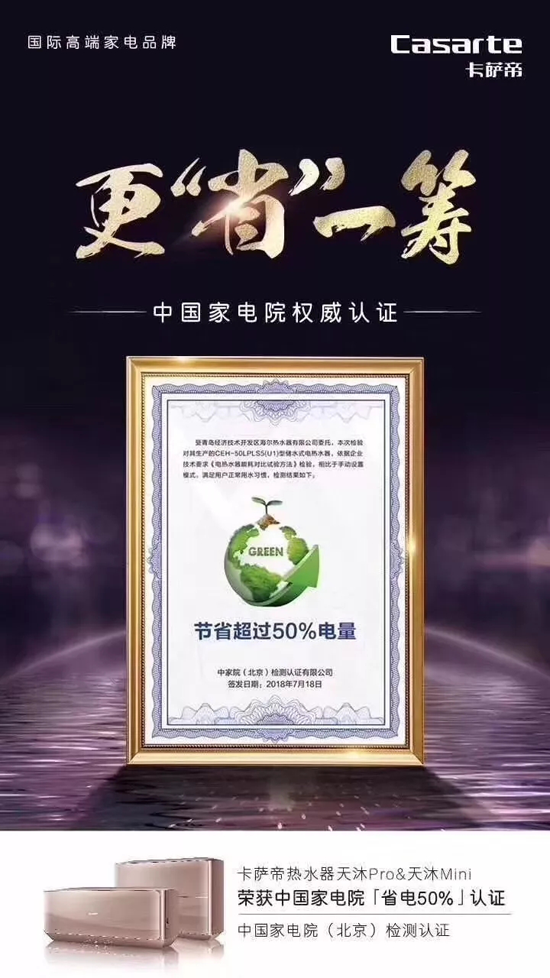 卡薩帝電熱水器獲得中國家電學會“節能50%”認證