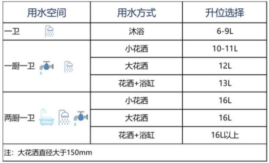 一廚一衛(wèi),衛(wèi)生間花灑比較小的,10-11L足夠使用。花灑較大的,12L-13L更適合。