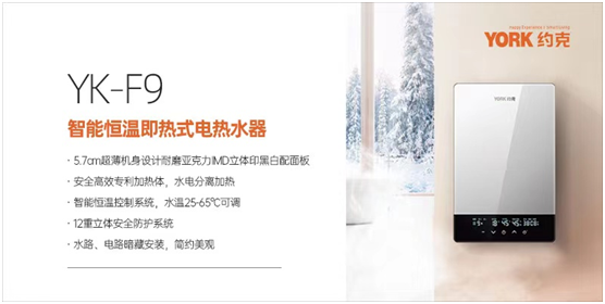 YORK約克智能恒溫即熱式電熱水器YK-F9,2秒即出熱水,水溫恒定舒適,25-65℃寬域溫度調控,可滿足全家人多場景的日常熱水使用需求。