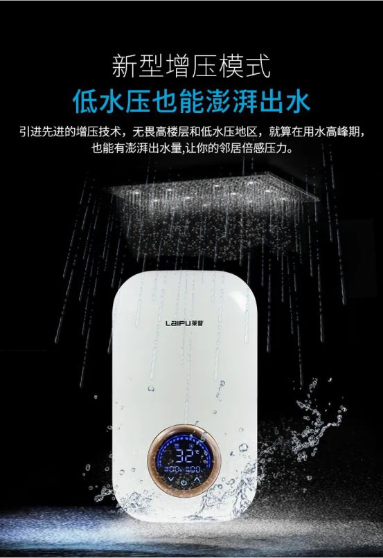 現(xiàn)在的商品房為了提高土地使用率,通常樓層很高,而這樣做導(dǎo)致的后果就是洗澡時(shí)要么水流很小,要么就是沒有水。而萊普即熱式熱水器采用新型增壓模式,低水壓也能澎湃出水,無(wú)畏高樓層和低水壓地區(qū)限制。