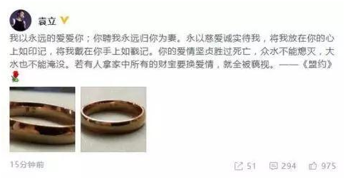 袁立正式宣布結(jié)婚后在微博曬出與老公梁太平的婚戒,戒指內(nèi)部分別刻有兩人的名字,她還甜蜜配文:“我以永遠(yuǎn)的愛愛你;你聘我永遠(yuǎn)歸你為妻。永以慈愛誠實待我,將我放在你的心上如印記,將我戴在你手上如戳記。你的愛情堅貞勝過死亡,眾水不能熄滅,大水也不能淹沒。若有人拿家中所有的財寶要換愛情,就全被藐視。——《盟約》”
