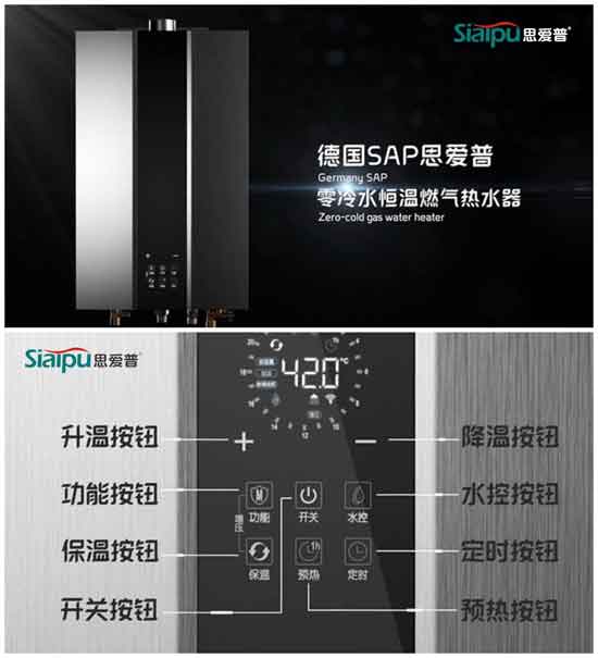 思愛普零冷水恒溫燃氣熱水器擁有簡約開關面板,操作易懂、即開即熱,無需等待,且可提供升溫、降溫、保溫、預熱、定時、水控等多樣個性選擇,無時無刻滿足一家人對大量熱水的供應需求。此外,思愛普零冷水恒溫燃氣熱水器擁有抗菌抗腐的環保無氧銅大水箱、進口全自動比例閥、瑞士進口穩流系統、日本大揚程循環水泵、雙通道水路系統等特殊設計,為產品的超強運作奠定堅實的基礎。