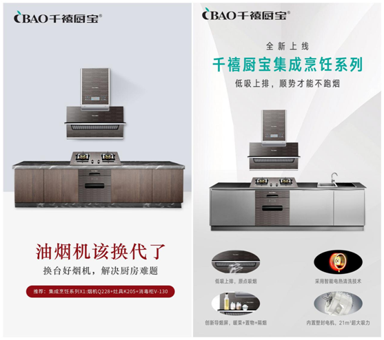 千禧廚寶集22年廚衛經驗之大成,在滿足消費者“智能、健康、環保”的普遍需求基礎上,融合功能與美學設計之差異化優勢,匠心打造出集煙機、灶具、消毒柜于一身的“集成烹飪系列”全新套裝臻品。準確把握市場商機,更先一步引領廚衛市場“新式集成藝術”的潮流發展,這便是千禧廚寶,一個走在行業前沿、致力于“讓幸福發生”的民族品牌。