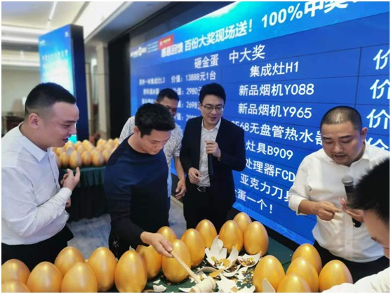亮點滿滿的優(yōu)惠政策一經(jīng)公布,再次將現(xiàn)場的熱烈氣氛推向新高度。透過經(jīng)銷商發(fā)自內(nèi)心的肯定與滿臉的喜悅之情,我們能看出眾人心中已經(jīng)有了要下單訂貨的強烈欲望,這也正為接下來的下單打款環(huán)節(jié)奠定下基礎(chǔ)。而為感恩各位經(jīng)銷商的下單支持,銀田還特意準(zhǔn)備了砸金蛋環(huán)節(jié),將集成灶、煙機(jī)、熱水器等豪華大禮傾情相送。