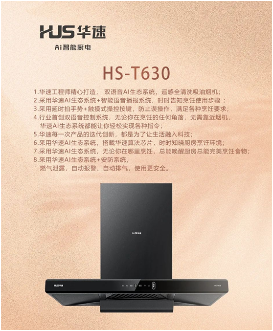 別擔心,“中國十大健康節(jié)能廚衛(wèi)電器品牌”——華速廚衛(wèi),幫你徹底解決廚房油煙問題。和其他油煙機不同的是,華速雙語音AI生態(tài)系統(tǒng),遙感全清洗吸油煙機——HS-T630將煙機吸風(fēng)口下潛至距灶臺350MM黃金控?zé)焻^(qū),同時在頂部機身增加了輔助進風(fēng)口,并通過雙風(fēng)口環(huán)吸技術(shù),把油煙直接從油煙產(chǎn)生處吸走,達到靠得越近吸得越凈的效果,真正實現(xiàn)油煙不上臉,讓烹飪者徹底遠離油煙困擾。此外,其還具有以下5大特點: