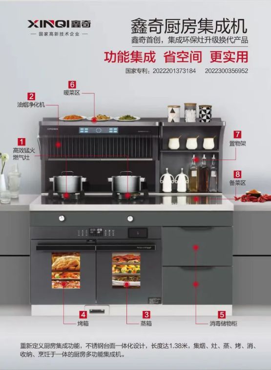 鑫奇1米38廚房集成機:高效猛火灶十油煙凈化機十蒸箱+烤箱+消毒柜十暖菜寶+備菜區+置物架,八大功能,完美時尚,智能首創,省空間,更實用。