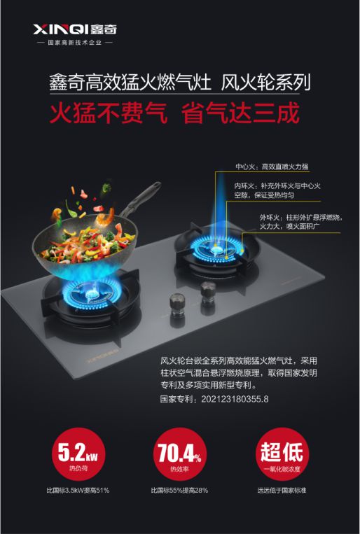 鑫奇高效猛火灶,高負荷、高熱效率,火猛不費氣,省氣達三成,一天省一元,而且超低一氧化碳,既省錢,又環保,又健康。