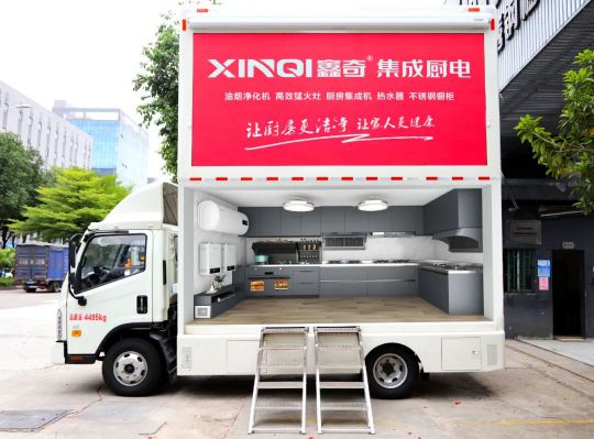 “省氣30%的高效猛火灶來了,能實現99%油煙分離率的油煙凈化機來了,省空間、更實用的廚房集成機來了,高端耐用的不銹鋼櫥柜來了,鑫奇移動廚房體驗車,帶著超國標專利集成廚電開啟‘工廠進小區惠民行動’啦”。