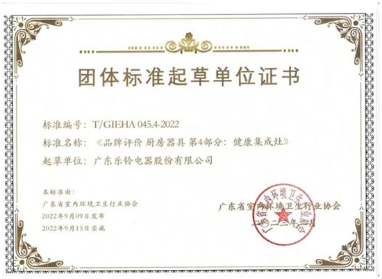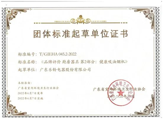 樂(lè)鈴憑借著在廚房電器領(lǐng)域內(nèi)吸油煙機(jī)和集成灶對(duì)廚房油煙難關(guān)的攻克,參與《健康吸油煙機(jī)》、《健康集成灶》等團(tuán)體標(biāo)準(zhǔn)的制定,推動(dòng)行業(yè)的健康升級(jí),守護(hù)億萬(wàn)家庭的呼吸健康。