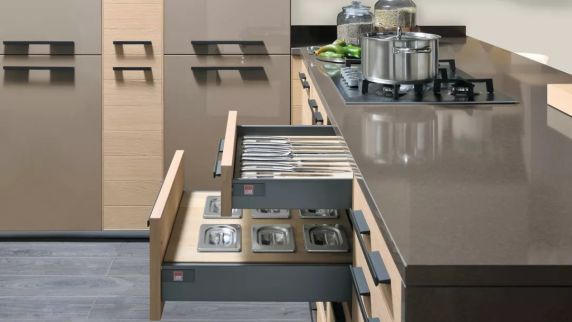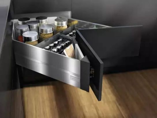 除此之外,這歌系列抽屜的抽幫、金屬蓋板、插板在顏色和材質(zhì)上可以實(shí)現(xiàn)統(tǒng)一無(wú)縫對(duì)接,如果對(duì)廚房?jī)?nèi)部有特殊的應(yīng)用需求,也能一并滿足,例如抽槽或者轉(zhuǎn)角抽屜,更有效的利用櫥柜內(nèi)的空間利用率。