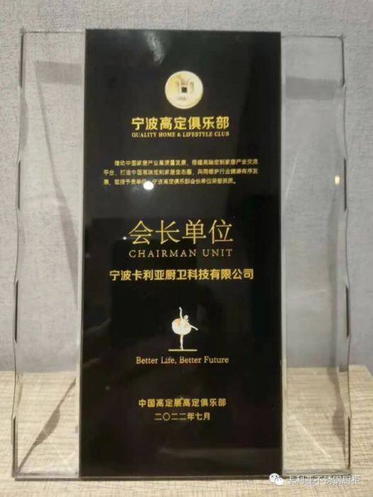 卡利亞不銹鋼櫥柜獲“寧波高定俱樂部會長單位”