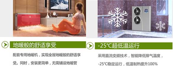 南極星極光?變頻速熱空氣能采用直流變頻技術(shù),智能降低排氣溫度,-25℃超低溫環(huán)境下穩(wěn)定運(yùn)行,低溫制熱量提升100%,可以滿足我國(guó)90%以上寒冷地區(qū)的熱水、采暖,很好的解決了空氣能熱泵在低溫環(huán)境下“低溫低能效”的不足。與“溫暖+Ⅲ”專用地暖機(jī)黃金搭檔,實(shí)現(xiàn)全屋地暖般的舒適享受,而且無(wú)需鋪設(shè)地暖管,安裝更簡(jiǎn)單,省下大量的安裝費(fèi)用。