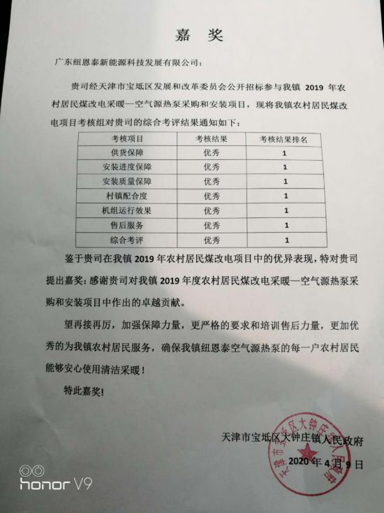 函中提到,近日,大鐘莊鎮人民政府組織的大鐘莊鎮農村居民煤改電項目考核組對該鎮2019年農村居民煤改電情況進行了考核??己隧椖糠謩e為供貨保障、安裝進度保障、安裝質量保障、村鎮配合度、機組運行效果、售后服務、綜合考核七項。在考核中,紐恩泰不僅在每個項目中都獲得了“優秀”的好評,還拿下了所有項目的第一名,成為該鎮2019年煤改電當之無愧的“狀元”品牌。因此,大鐘莊鎮人民政府特發此函,以感謝紐恩泰對該鎮2019年農村居民煤改電采暖作出的卓越貢獻。